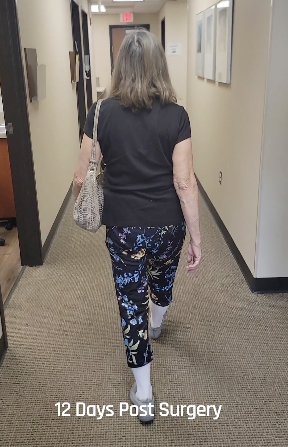 Sue had her right hip replaced 6 weeks ago. She's doing 100% better after the anterior approach to the total hip. Previously it was painful for her to walk, and she is now walking with no pain.